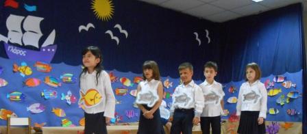 Δεκάδες πολύχρωμα ψάρια μικρά και μεγάλα, κοράλια και κοχύλια και πιο πέρα ένα καράβι με λευκό πανί και ένας ήλιος λαμπερός, όλα χειροτεχνίες των παιδιών, δημιουργούσαν το σκηνικό της παράστασης φανερώνοντας τη δημιουργική δουλειά της Α΄τάξης, όλη τη σχολική χρονιά